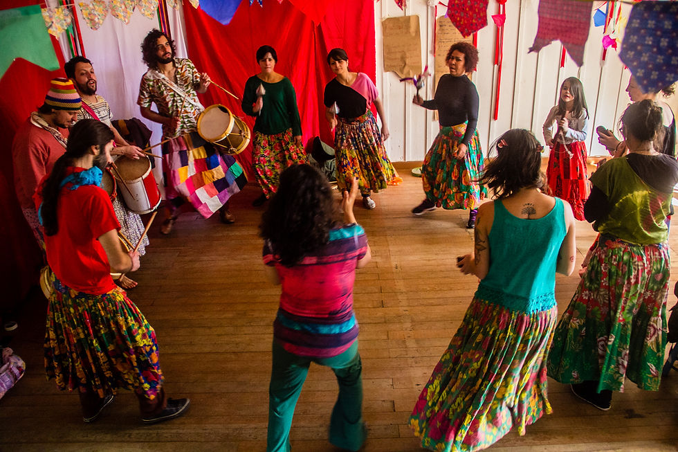 A oficina possibilita investigações de um corpo e uma voz que brinca e se relaciona com o outro, que reza cantando e dançando, que improvisa versos ressignificando seu cotidiano, que constrói flores de papéis ou bordados com missanga enquanto cria melodias. O prazer do brincar coletivamente, cantar e dançar em roda, a partir dos elementos presentes na cultura popular: seus toques, danças, cantos, plásticidades e poesias. Brincar o coco, a ciranda e o cacuriá, vivenciando o universo artístico e poético do povo brasileiro.
